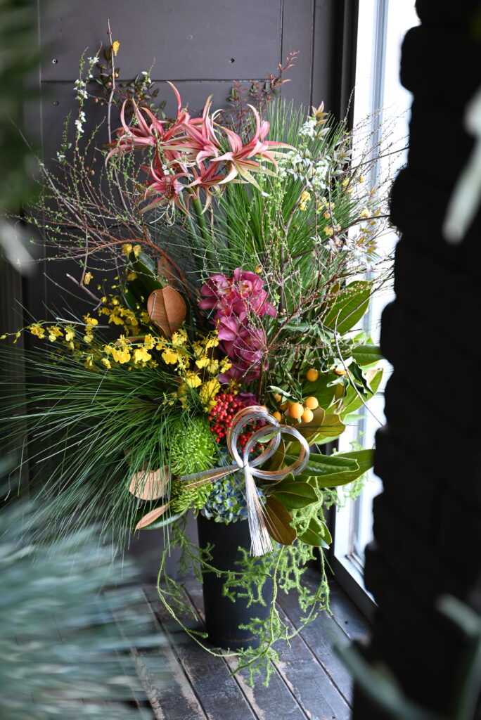 松や南天など、縁起のお正月花材も入った豪華な迎春アレンジ。ご予算、お好みに合わせてお作り致します。