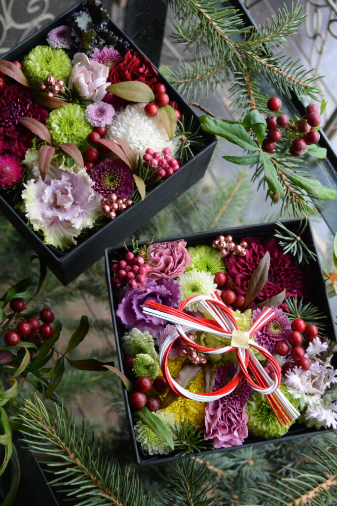 重箱BOXに入った花のおせちが2段に重なったセット。 二つ並べてどうぞ。